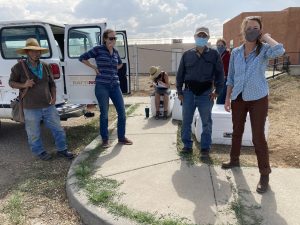 We are excited to have distributed two rounds of bulk beef and lamb over the last two weeks. Five ranchers have benefited from the direct sales and are excited about building this relationship with our local market. Nineteen families are enjoying the quality of grass fed and grass finished beef and a full freezer heading into the winter.We have more sides of beef available now and are looking for additional processing slots for more lamb. Please reach out if you’d like to share a side. This was an effort by one of AIRE’s projects, Rios del Norte Farmer & Rancher Co-op. We expect to offer family packs of beef in the near future for those of you who want a smaller amount. Pictured above from left to right, a sheep rancher from New Buffalo, a beef customer, Jae Sanders – Coordinator of the direct meat sales project, and Robert Martinez – Coordinator of the Rios del Norte Ranch Coop and our primary rancher, along with two more customers. Pictured below – Beef customers splitting up a side of beef among themselves in the TCEDC parking lot. The lamb was tender and delicious. We loved it and are ready to split some beef!!! ~ K.L. I am over the moon that Micah and Jay at the Farmhouse Cafe have made it possible to buy beef directly from our local ranchers. I was able to meet the rancher I bought the beef from, Robert Martinez. I was very impressed with his integrity and interest in how we like the beef. I am delighted to be able to support Micah’s efforts to make products available from so many different local farmers and ranchers through the Farmhouse Cafe, CSA program, school lunch program, and now allowing Taos County locals like myself to participate in buying food directly from them. Her team’s commitment to increasing food security in the valley is a project very close to my heart. All I can really say is thank you so much for all the hard work! Keep it up! ~ A.S.